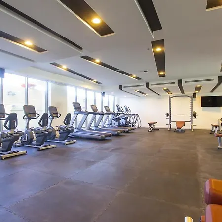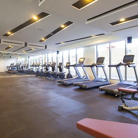 Los huéspedes pueden hacer ejercicio en un gimnasio y relajarse en un centro de bienestar.